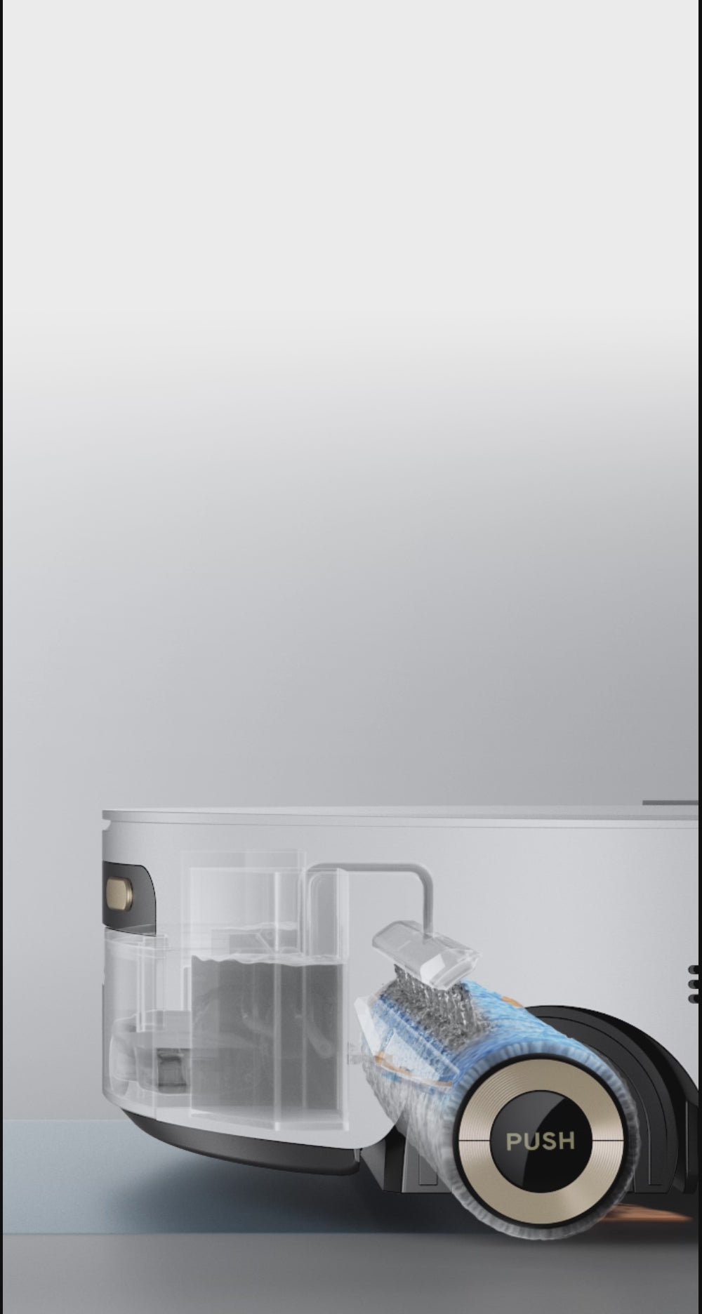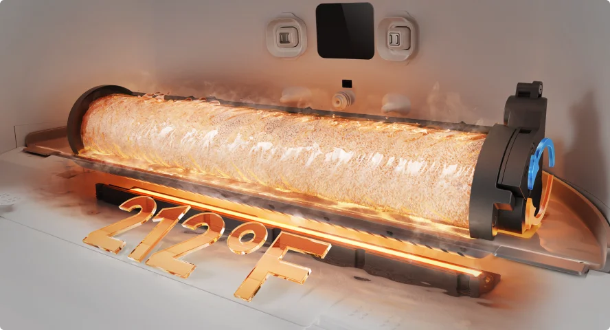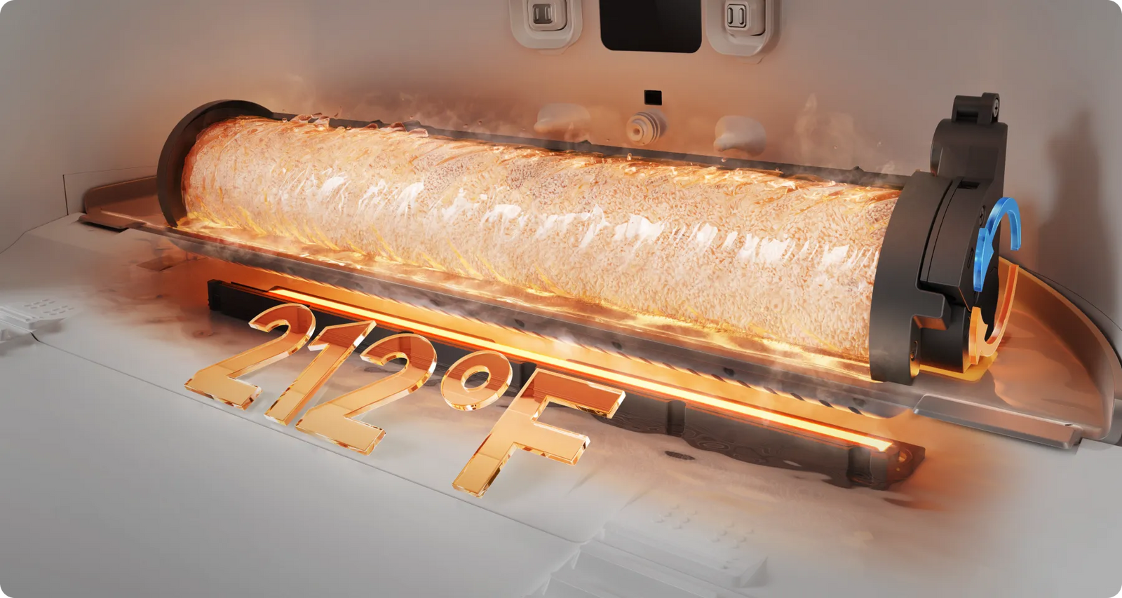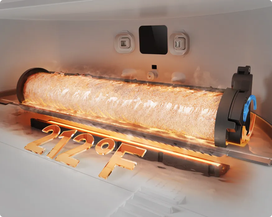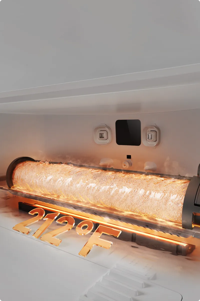 The vacuum gives itself a 'hot bath' after cleanup via its 212℉* ThermoHub™ roller self-cleaning technology, rotating forward and backward in the base station, removing heavy stains, and neutralizing odors attached to the roller mop.