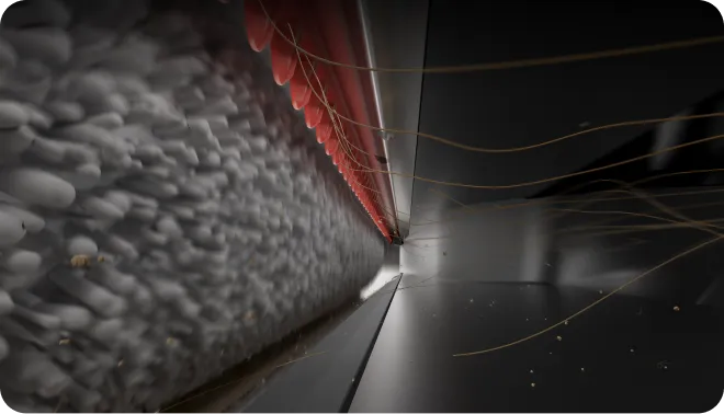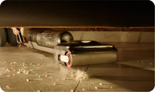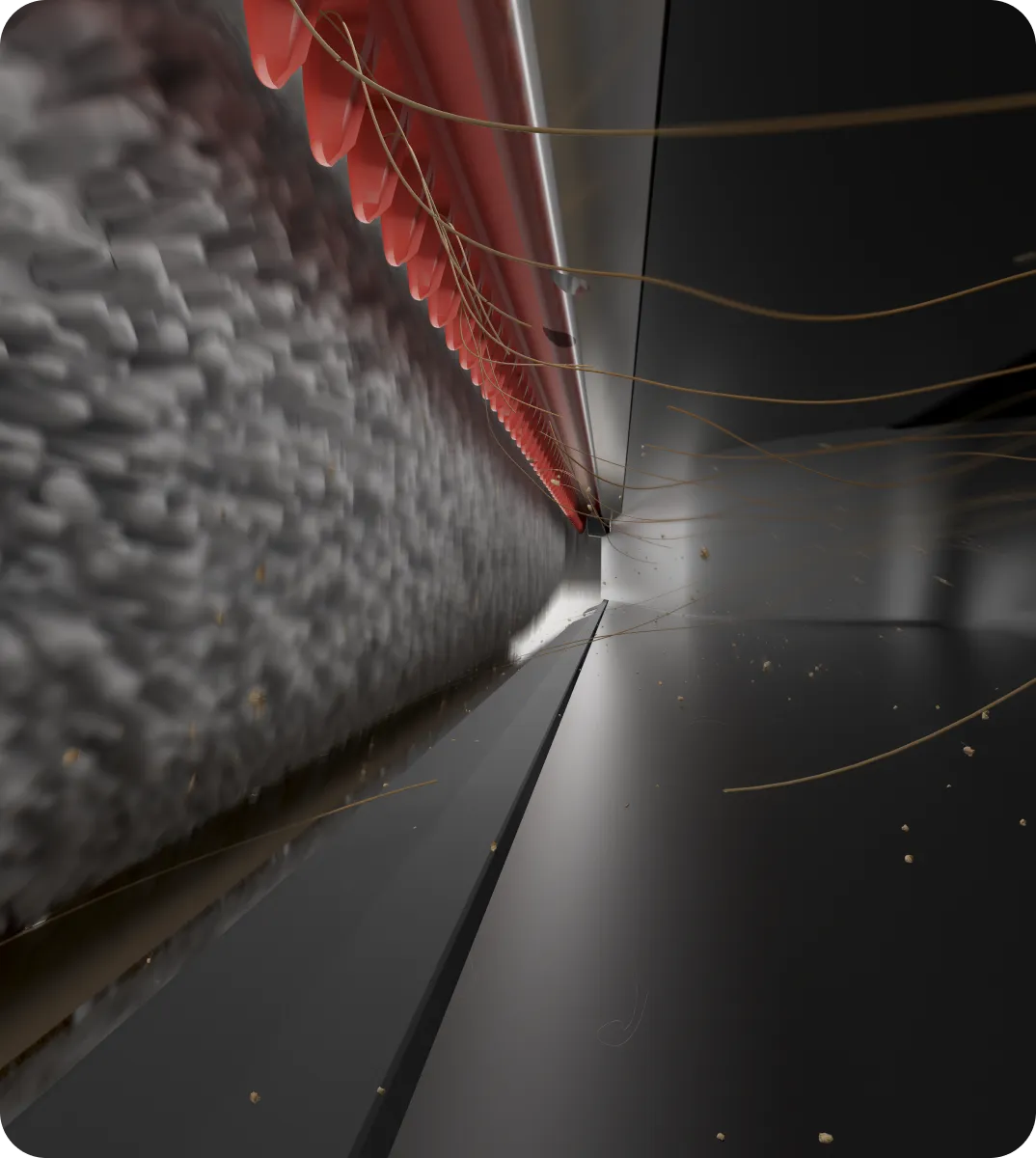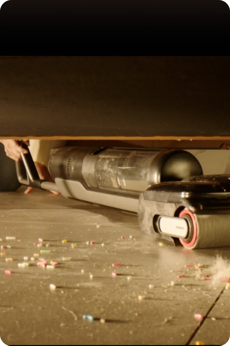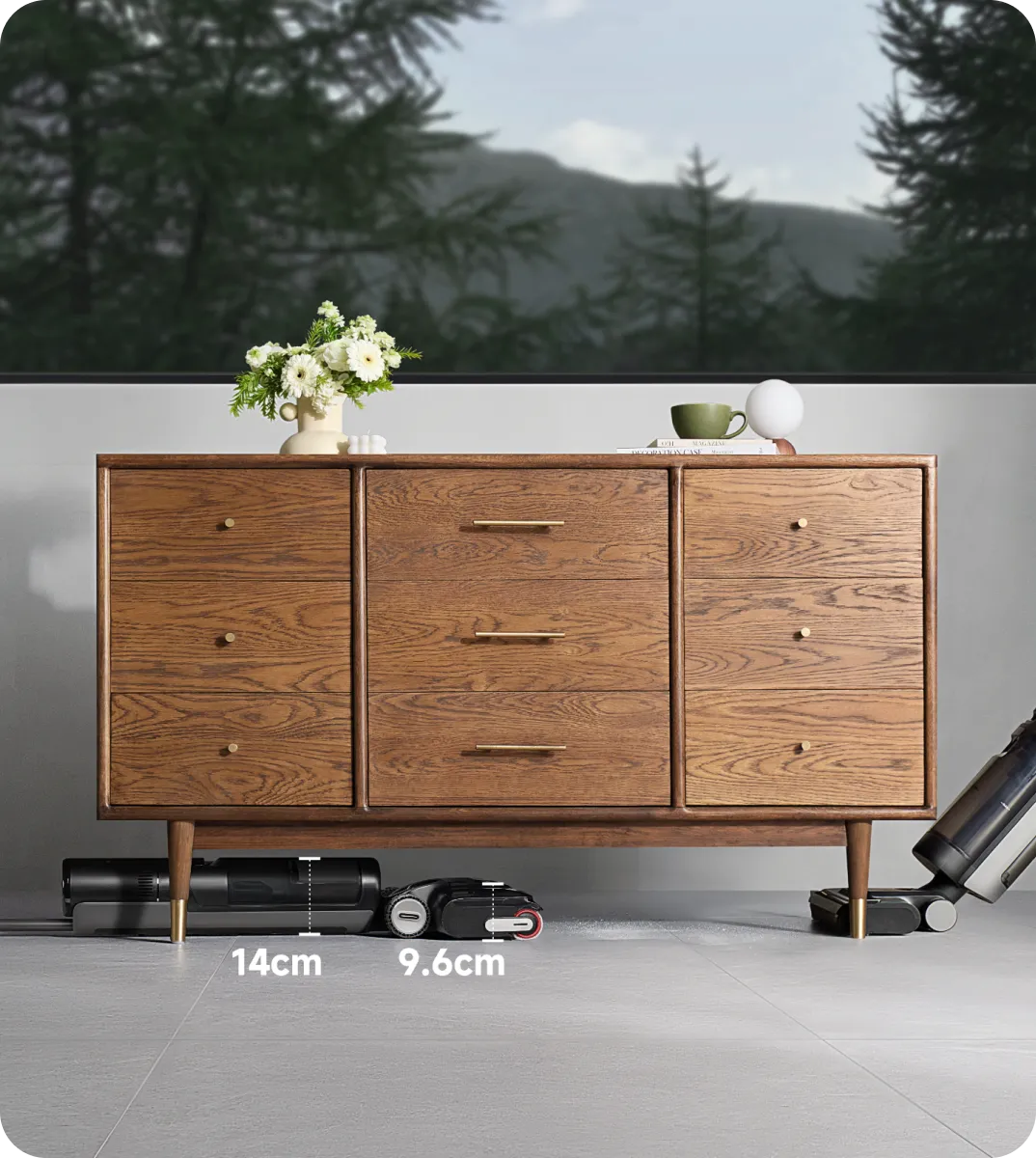 *180°, 14cm, 9.6cm: The entire body of the vacuum cleaner can reach spaces as low as 14cm and the brush head as low as 9.6cm. Based on our in-house lab data.