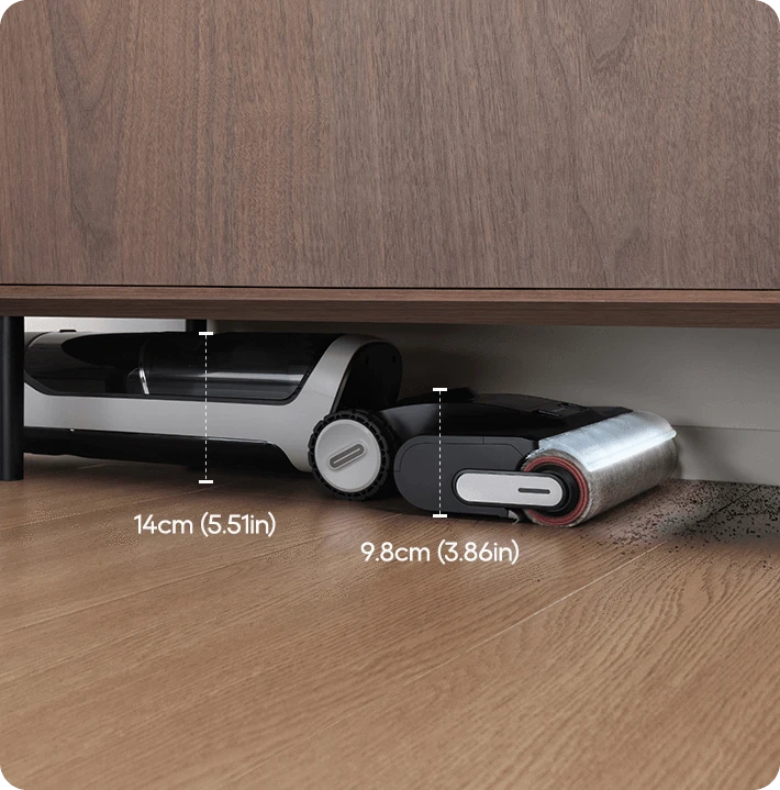 ¹180°, 5.5in (14cm), 3.86in (9.8cm): The entire body of the vacuum cleaner can reach spaces as low as 5.5in (14cm) and the brush head as low as 3.86in (9.8cm), based on Dreame Lab testing data.