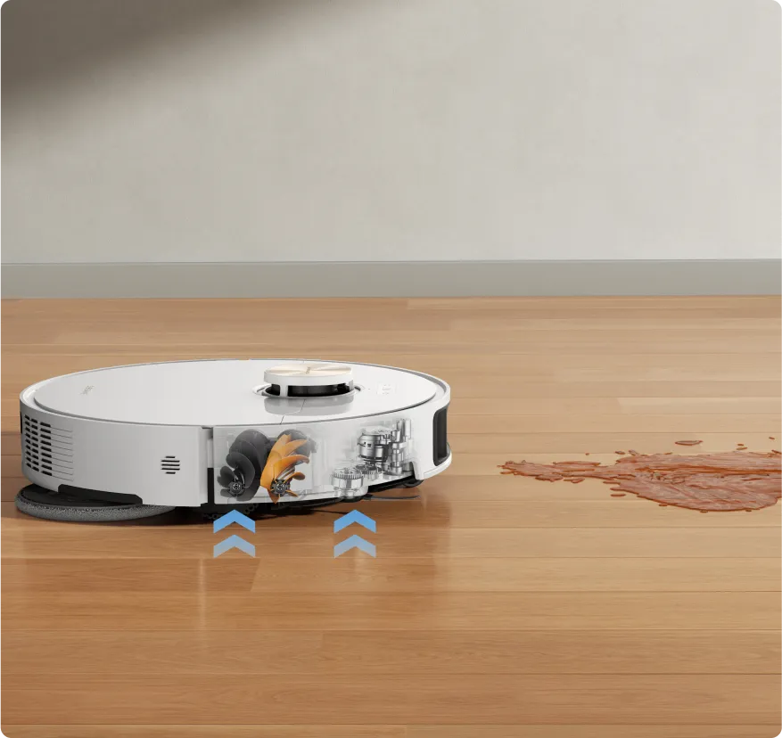 With the TripleUp Tech, L50 Ultra lifts the side and main brushes while lowering its mop pads for thorough floor cleanliness. It effectively handles stains like milk or coffee, keeps brushes dry, and prevents the spread of odors in the dust box.