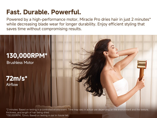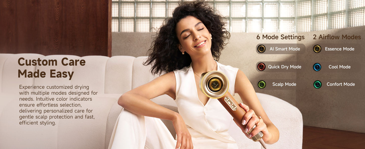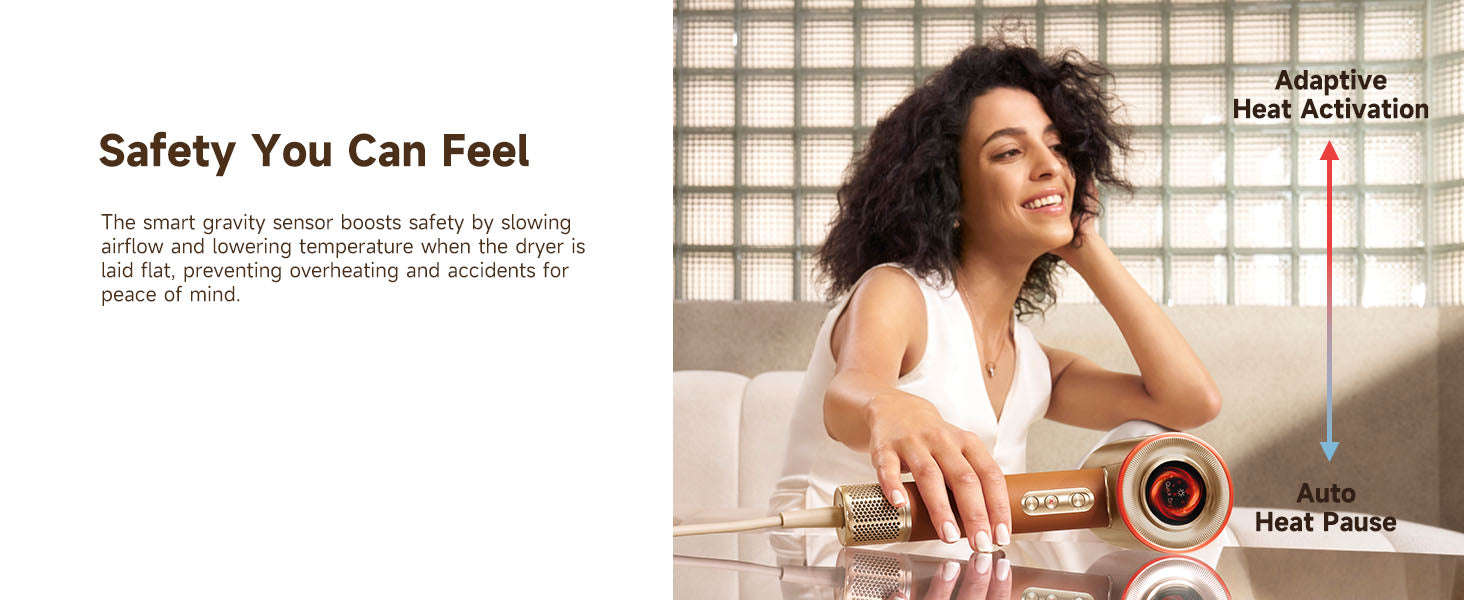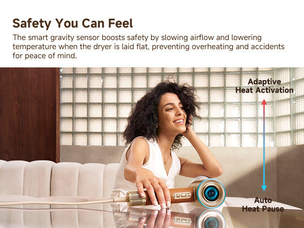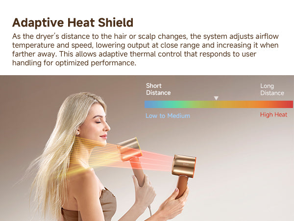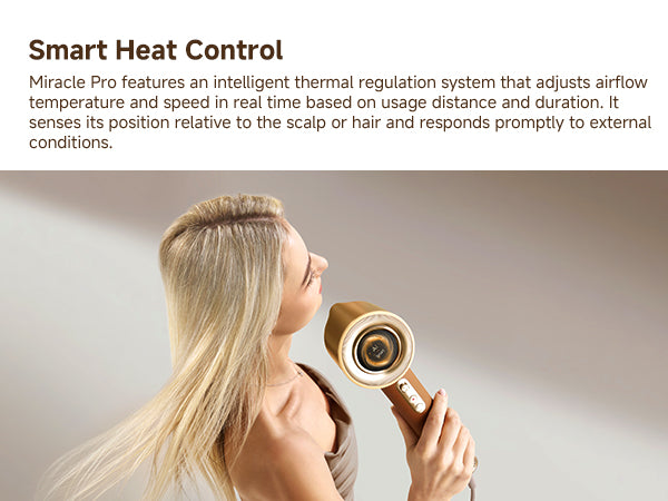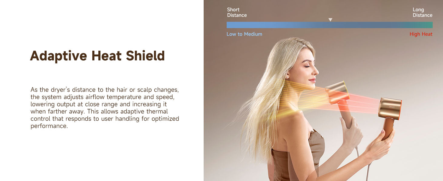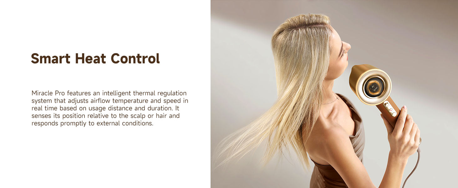 Smart heat control auto-adjusts airflow and temperature by distance and duration